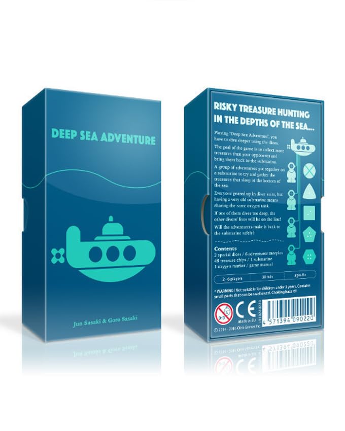 - "لعبة مغامرة أعماق البحار" هي تجمع بين المتعة والتشويق مع مزيج من الاستراتيجية والحظ. تقدم تجربة مثيرة لاستكشاف أعماق البحار وجمع الكنوز، مع ضرورة إدارة موارد الأكسجين بشكل جيد للعودة إلى الغواصة بسلام. توافق عمر 9 سنوات فما فوق .عدد اللاعبين بها من 2 إلى 6 لاعبين . كل لاعب يتحكم في غواص يحاول جمع الكنوز من قاع البحر .يتم استخدام النرد للتحرك على اللوحة وجمع الكنوز. كلما غاص اللاعب أعمق، زاد خطر نفاد الأكسجين. إذا نفد الأكسجين، يخسر اللاعب جميع الكنوز التي جمعها.