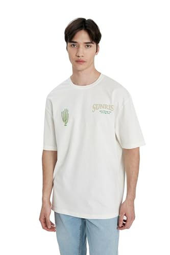 DeFacto - تيشرت منسوج بقصة مريحة برقبة دائرية ضيقة وأكمام قصيرة للرجال من ديفاكتو، لون أوف وايت، مقاس XS، موديل B8488AX