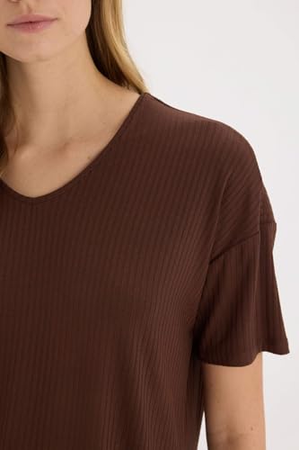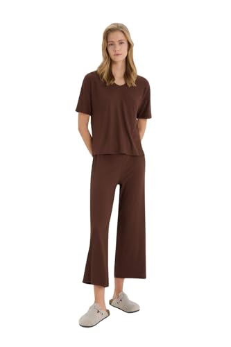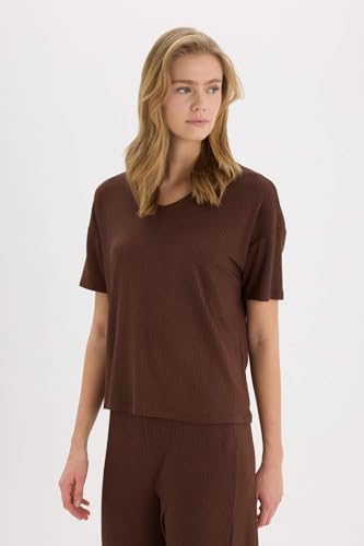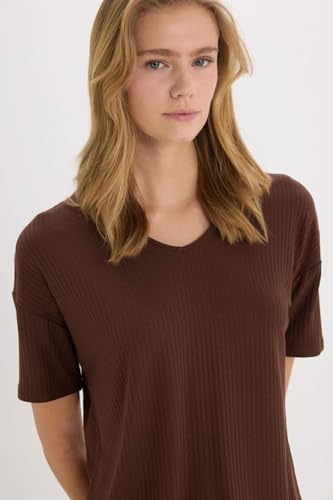 DeFacto - ديفاكتو طقم ملابس منزلية كاجوال بقصة عادية ورقبة شكل V واكمام قصيرة للنساء، لون بني، مقاس L
