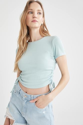 DeFacto - ديفاكتو تي شيرت محبوك باكمام قصيرة ورقبة دائرية ضيقة للنساء بلون اخضر مينت مقاس XS