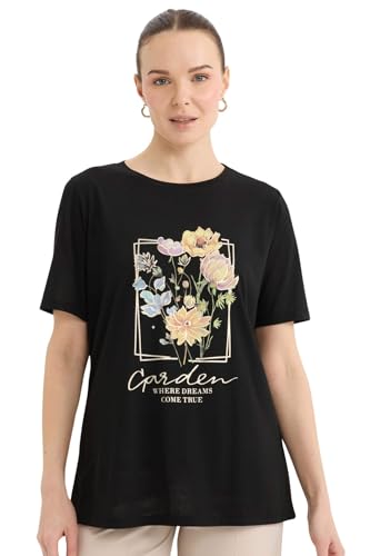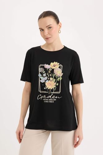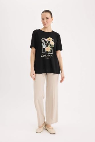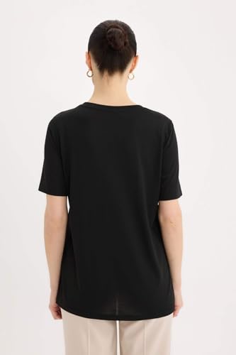 DeFacto - ديفاكتو تي شيرت نسائي بقصة عادية ورقبة دائرية واكمام قصيرة تريكو تقليدي E1212AX، اسود، مقاس M