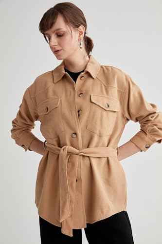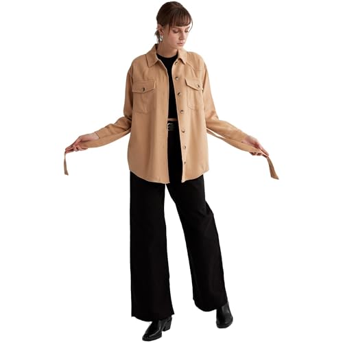 DeFacto - ديفاكتو بلوزة طويلة منسوجة باكمام طويلة ورقبة قميص للنساء، لون بيج، مقاس L
