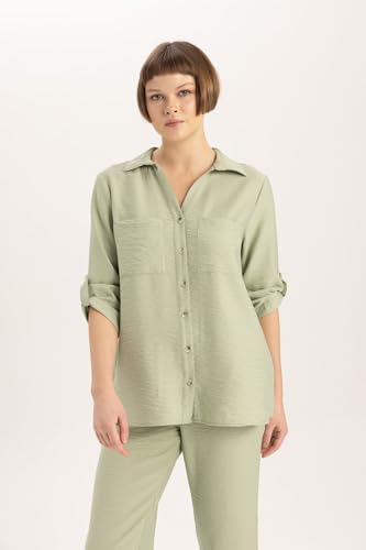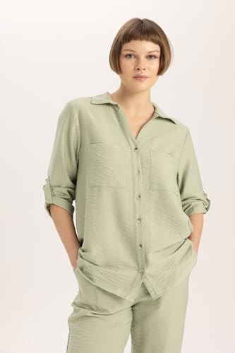 DeFacto - قميص كاجوال منسوجة بقصة عادية وياقة قميص وكم ثلاثة أرباع للنساء طراز M9407AZ من ديفاكتو، لون أخضر، مقاس لارج L