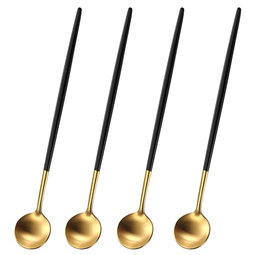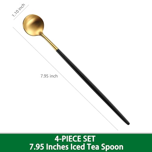 Dehov - ملاعق تقليب طويلة SS18/10 بلون ذهبي ساتان مقاس 7.95 انش بمقبض اسود من ديهوف، ملاعق خلط انيقة بمقبض طويل للقهوة والكوكتيل والايس كريم والحليب