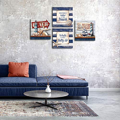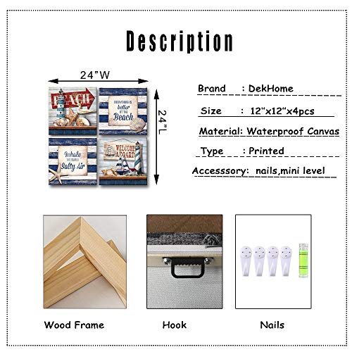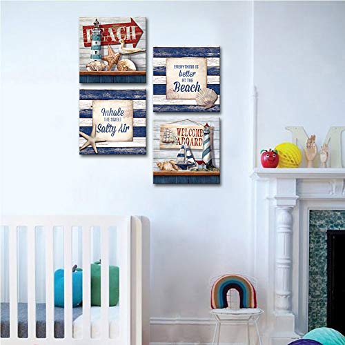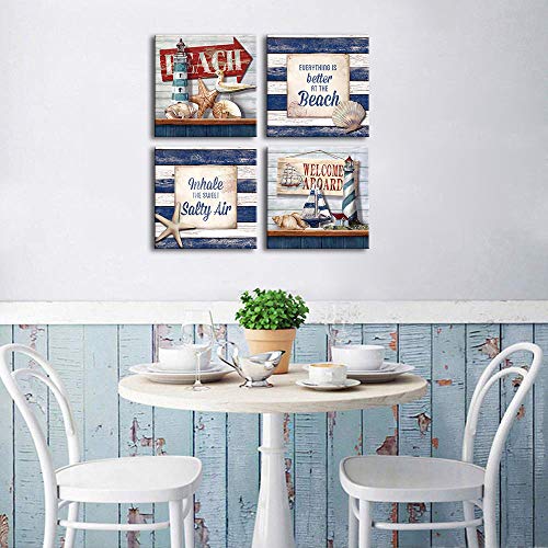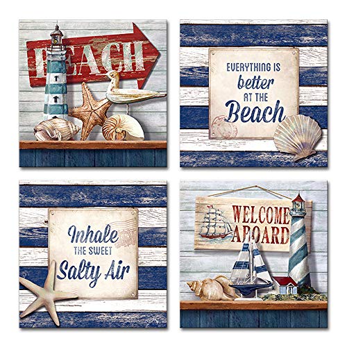 DekHome - لوحة حائط فنية قماش بتصميمات بحرية منارة وقارب شراعي مطبوعة على خلفية خشب من ديك هوم،لوحة قماش بتصميم اقتباسات تحفيزية لديكور غرفة الاستحمام والمطبخ، مؤطرة ومشدودة وجاهزة للتعليق، مقاس 30×30 سم×4 قطع