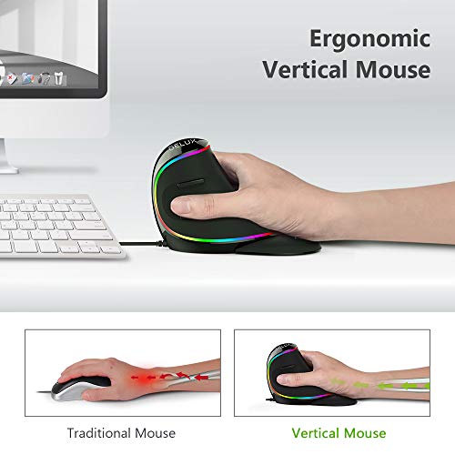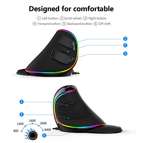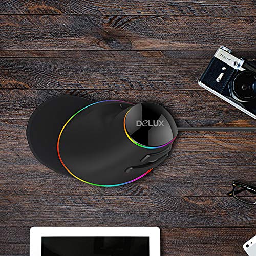 DELUX - ماوس العاب ديلوكس M618 بلس باضاءة ليد بالوان ار جي بي بتصميم عمودي سلكي مريح، ماوس بصري بمنفذ USB ودقة تتبع قابلة للتعديل و6 ازرار تحكم للكمبيوتر واللاب توب والكمبيوتر المكتبي مع دعم للمعصم