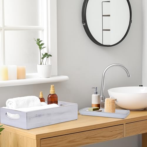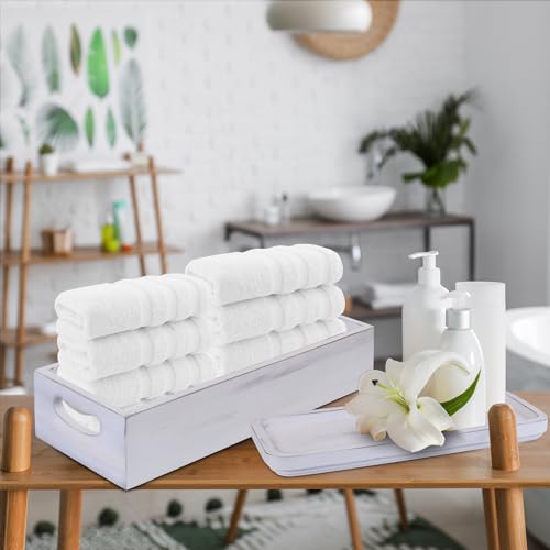 Demigo - مجموعة من 2 صندوق علوي للحمام وصينية زينة ديميجو - حامل ورق تواليت خشبي ريفي للحوض وغرفة النوم المعيشة ومدخل غرفة - ديكور منزلي جذاب مع مقبض للتنظيم ابيض شكل مستطيل