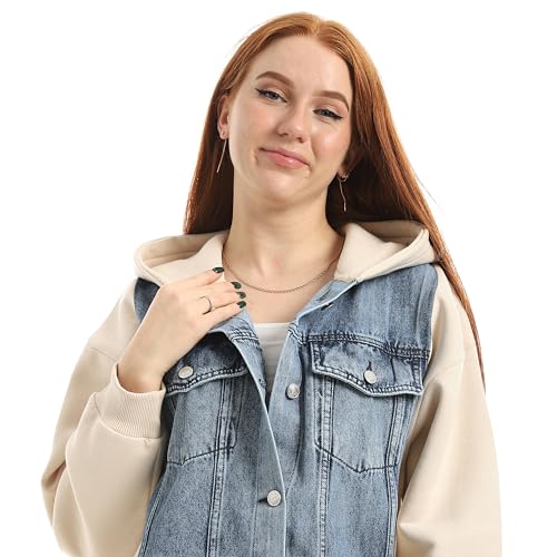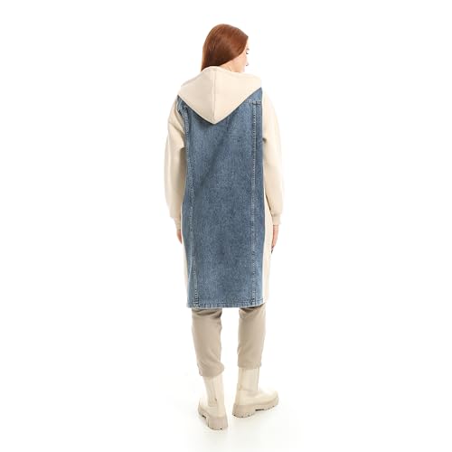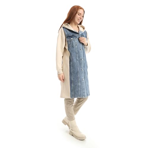 Coctail - فستان طويل هايبرد من الجينز والسويت شيرت، جينز أزرق فاتح مع أكمام كريمية، نمط زر أمامي، تصميم بغطاء للرأس