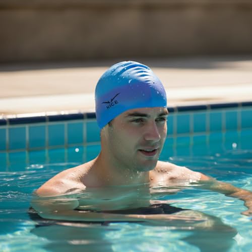 - قبعة سباحة من السيليكون باللون الأزرق الفاتح والأزرق مع تصميم نظيف يحسن تدفق المياه وكفاءة السباحة، مادة مرنة لسهولة الارتداء، مناسبة للمبتدئين والمحترفين، مثالية للسباحة في حمام السباحة وفي المياه المفتوحة
