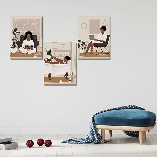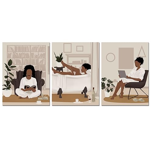 Derkymo - ديركيمو 3 قطع من لوحات فنية جدارية بنمط بوهو امريكي من افريقيا للنساء السود مطبوع عليها عبارة Relax And Enjoy The Time (12 انش × 16 انش × 3 قطع)، بني