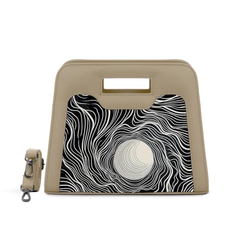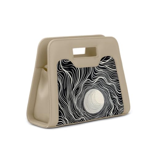 Generic - شنطة يد مصممة بنمط موج القمر، حواف جلد بيج، تصميم فني باللونين الاسود والابيض