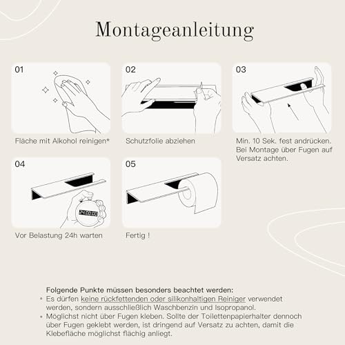 - ☑️ لا تحتاج إلى ثقب أو أدوات. ببساطة قم بتوصيل حامل بكرة المرحاض بالحائط باستخدام الشريط ذاتي اللصق 3 ام المتضمن. بعد 24 ساعة فقط، يصبح حامل ورق المرحاض جاهزًا للاستخدام - لا يحتاج إلى ثقب