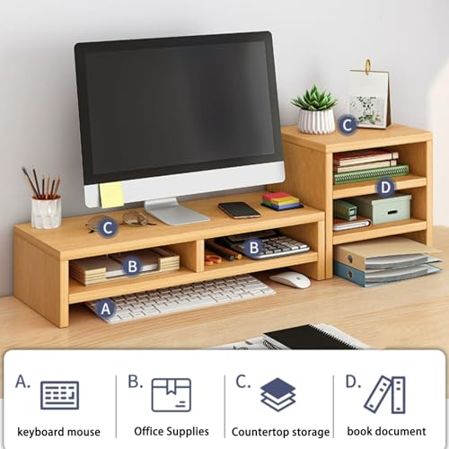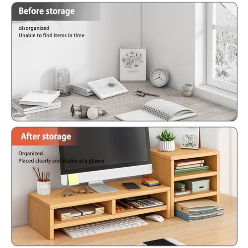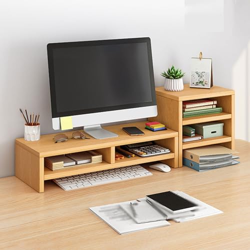 Matiko - منظم رف مكتب خشبي مجهز بحامل شاشة مرتفع، زيادة العمق لتخزين اكبر، رف سطح المكتب للمنزل والمكتب والكتابة والالعاب والدراسة، اللون: لون خشبي