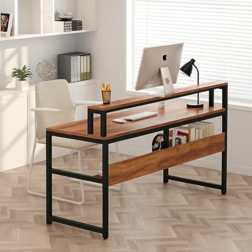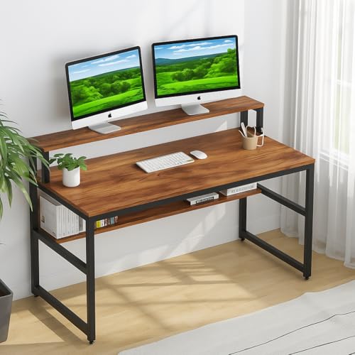 Deskio - مكتب كمبيوتر من ديسيو مع رف سفلي ورافع شاشة، طاولة لاب توب، طاولة دراسة، طاولة كتابة، طاولة صناعية، محطة عمل، طاولة متعددة الاغراض - بني (طول 120 × عرض 60 × ارتفاع 94 سم)