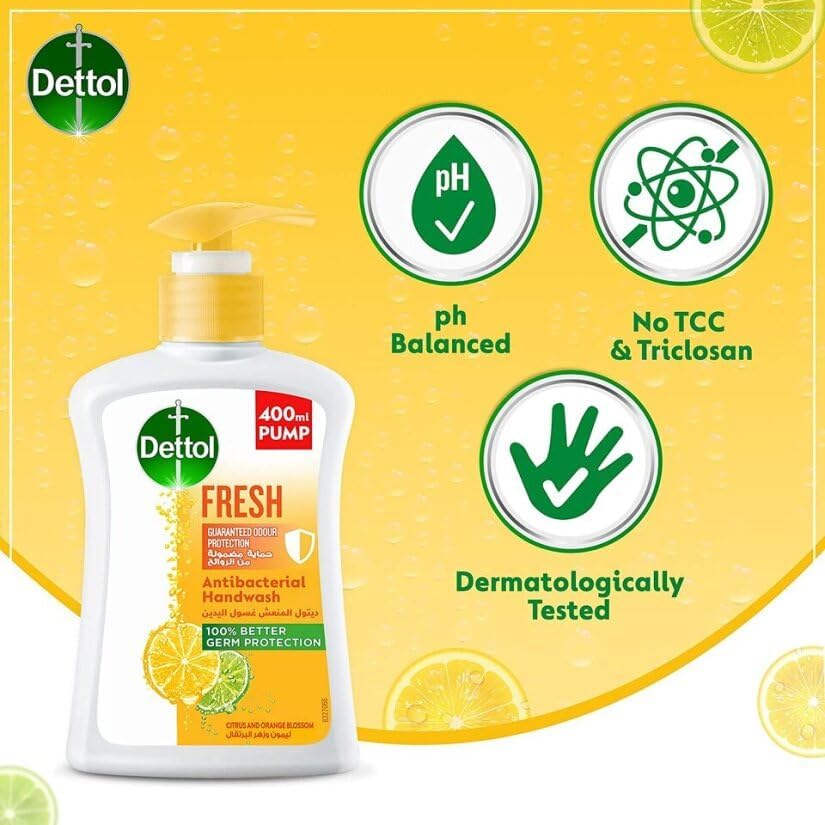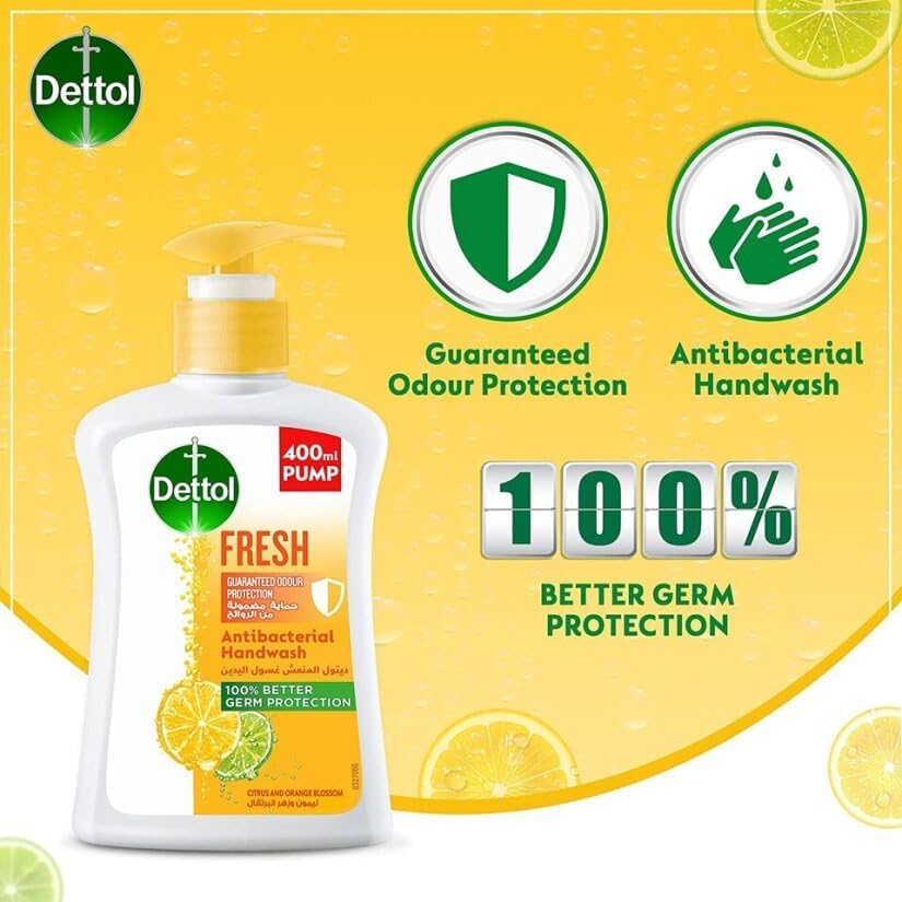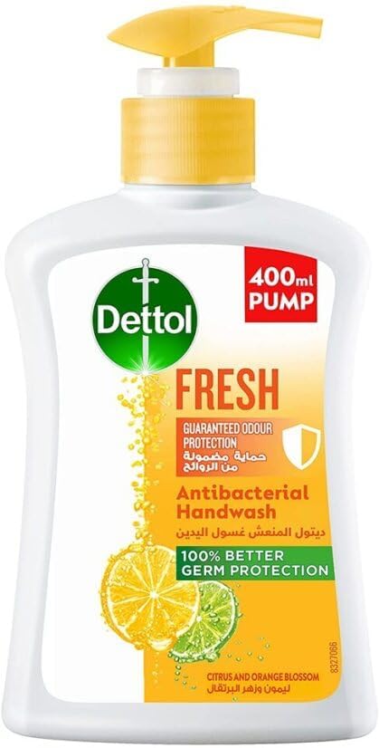 Dettol - مضخة صابون سائل فريش غسول اليد من ديتول أجل حماية فعالة الجراثيم وللنظافة الشخصية (يحمي 100 نوع المسببة للامراض) برائحة الحمضيات وزهور البرتقال، 400 مل