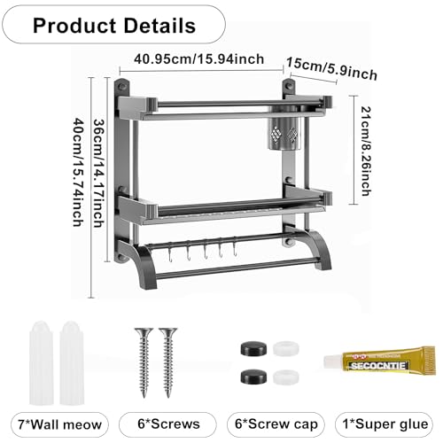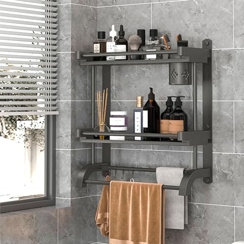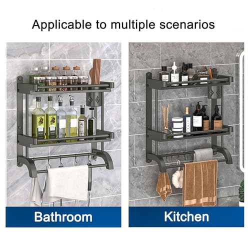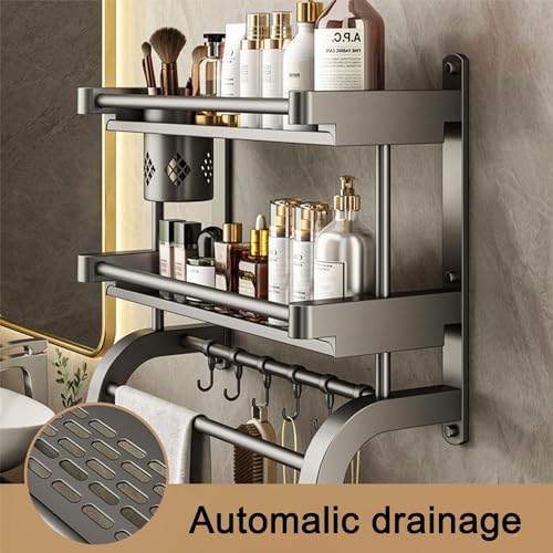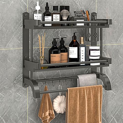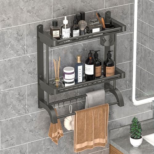 devesanter - حامل دش بدون ثقب رف حمام من طبقتين 40 سم فوطة يثبت على الحائط مع عمود و5 خطافات لغرفة النوم وغرفة المعيشة والمطبخ منظم للحمام لون رمادي ستانلس ستيل