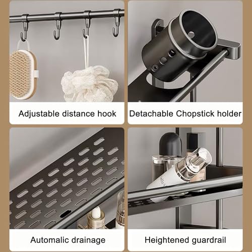 - حامل دش مصمم جيدًا مع عمود للفوطة: يمكن استخدام حامل الدش الحائطي المدمج هذا والمكون من 2 رف لتخزين الشامبو والشاور جل. يوجد تحت حامل الدش خمسة خطافات لتعليق الفرش والأقمشة وغيرها من الأشياء الصغيرة. يوجد أيضًا رف لتجفيف الفوط، والذي يمكنه تحسين مساحة التخزين في حمامك.