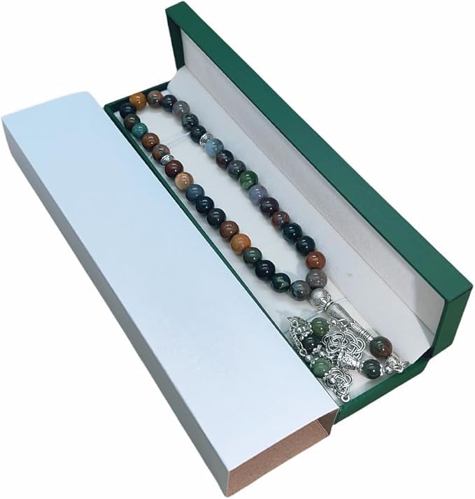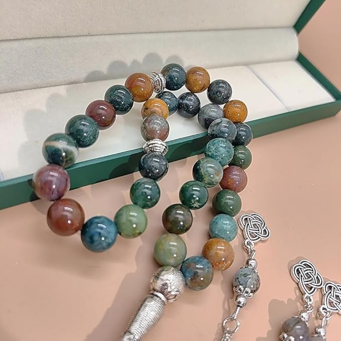 - 1. 33 سبحة من العقيق الهندي الطبيعي متعدد الألوان - خرز 10 ملم للصلاة اليومية أو التأمل.