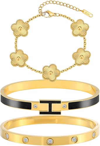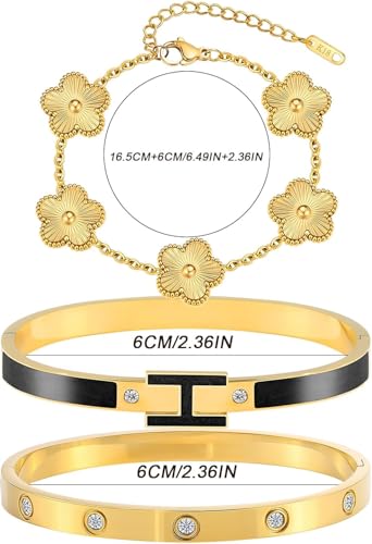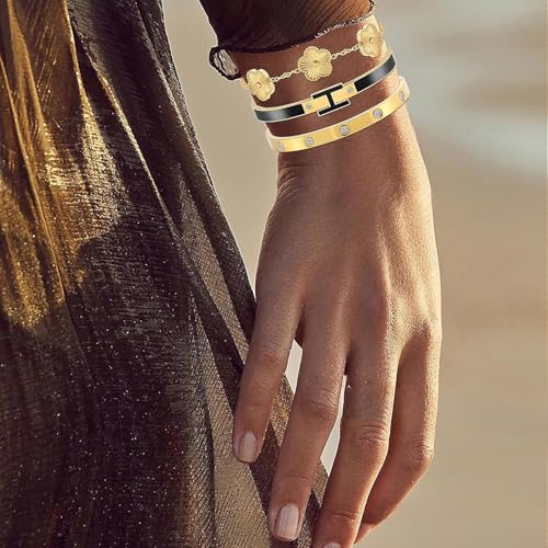 Generic - مجموعة اساور ذهبية قابلة للتكديس للنساء من دي اف - اساور حلقية على شكل حرف H / زهرة البرسيم / الحب | مجوهرات انيقة من الستانلس ستيل المطلي بالذهب عيار 18 قيراط، 7.0 انش، كريستال