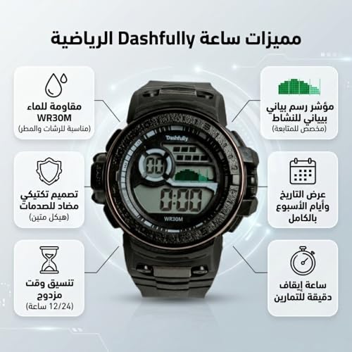 مقاومة للماء Wr30m، مضاد للصدمات، منبه، تقويم كامل، عرض التاريخ وأيام الأسبوع، إضاءة خلفية متعددة الألوان، ساعة إيقاف دقيقة للتمارين، تنسيق وقت مزدوج 12/24 ساعة، مؤشر رسم بياني للنشاط، تصميم تكتيكي، شاشة رقمية Lcd، مناسب للرشات والمطر، هيكل متين
