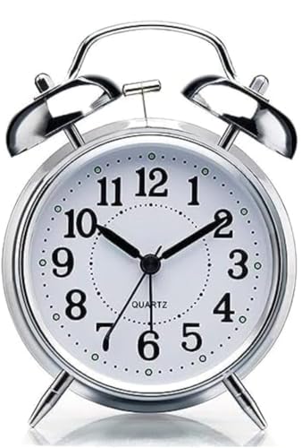 DHARMASHYA - ساعة منبه انالوج كلاسيكية بجرس مزدوج - ساعة طاولة باطار معدني كلاسيكي مع اضاءة خلفية ليلية، منبه مضيء عالي الصوت، حركة كوارتز دقيقة لغرفة النوم والمنزل والمكتب من دارماشيا، فضي