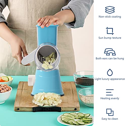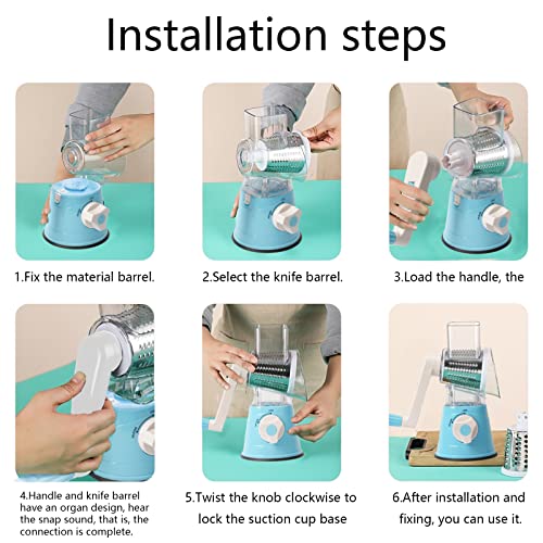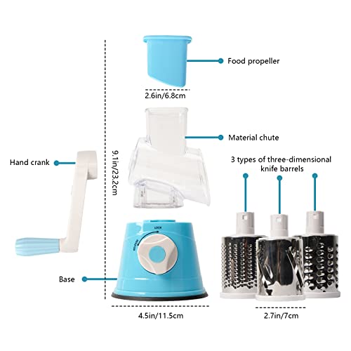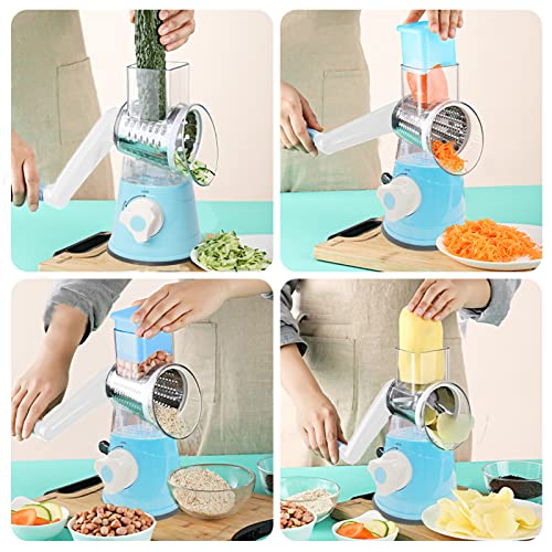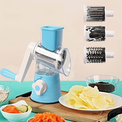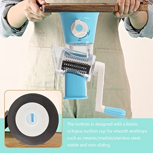DHISUFU - مبشرة جبن دوارة يدوية 3 في 1 متعددة الوظائف لتقطيع الخضار والفواكه مع 3 شفرات دوارة من الفولاذ المقاوم للصدأ وقاعدة لاصقة قوية من دي اتش اي اس يو اف يو