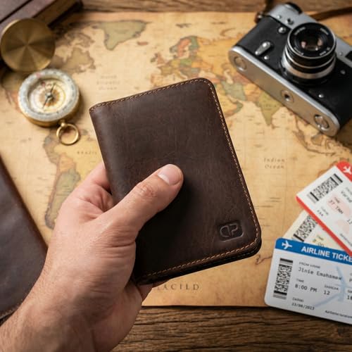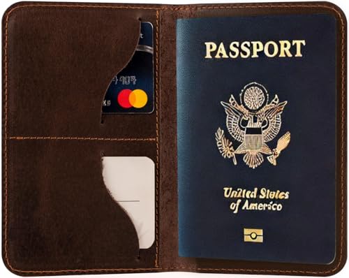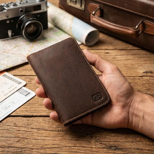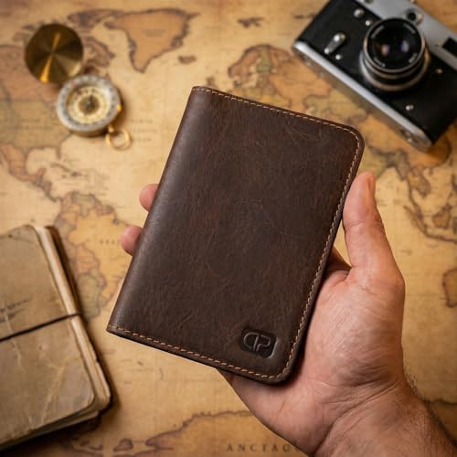 Dipelle - محفظة سفر وحامل جواز سفر مصنوعة يدويا من الجلد الطبيعي من دي بيل - حافظة جواز سفر رفيعة من الجلد المحبب بالكامل مع فتحات للبطاقات وجيب للمستندات - تصميم للجنسين (بني)