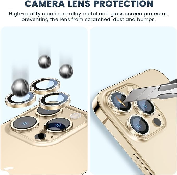 Generic - واقي عدسة كاميرا ماسي متوافق مع آيفون 14 برو/آيفون 14 برو ماكس من الزجاج المقوى اللامع بدرجة صلابة 9 وحلقات معدنية لاصقة HD شفافة، لون ذهبي