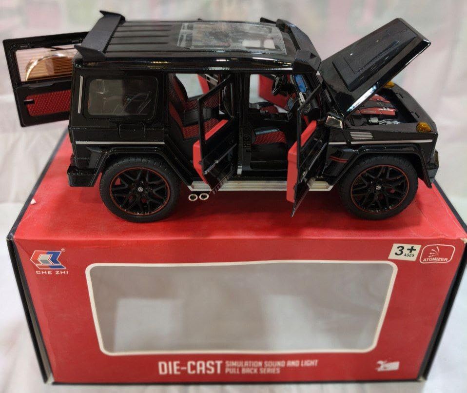 - تصميم مفصل: نموذج سيارات الدفع الرباعي الفاخر المعدني المصبوب بلمسة نهائية سوداء أنيقة مع لمسات داخلية حمراء، تتميز بتفاصيل نمط ألياف الكربون وعجلات من خليط معدني أسود مخصص