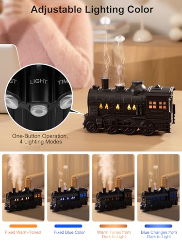 - 【2 مصباح ملون و2 وضع بخاخ】 توفر فواحة الزيت للمنزل ألوانًا زرقاء باردة ولهب، مما يضيف لمسة واقعية إلى التصميم على شكل قطار. محاكاة عمل قطار البخار الكلاسيكي ---- مع وضع إطلاق الدوائر البخارية ووضع الدخان الكثيف، ليقدم لك تجارب متنوعة تزيد من متعتك.