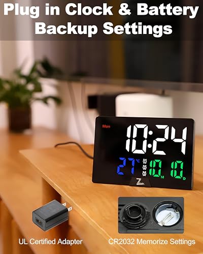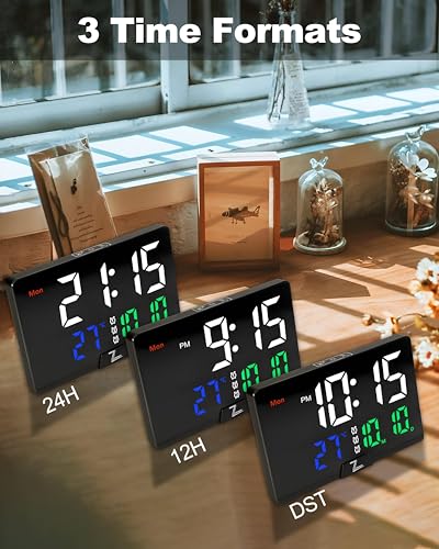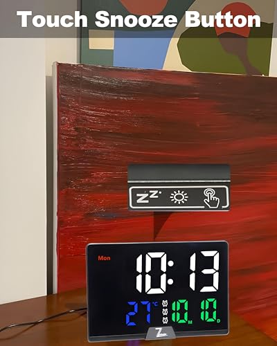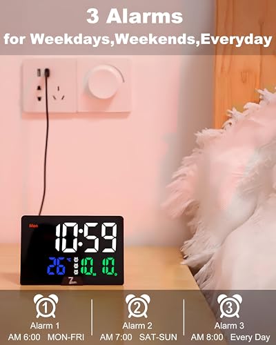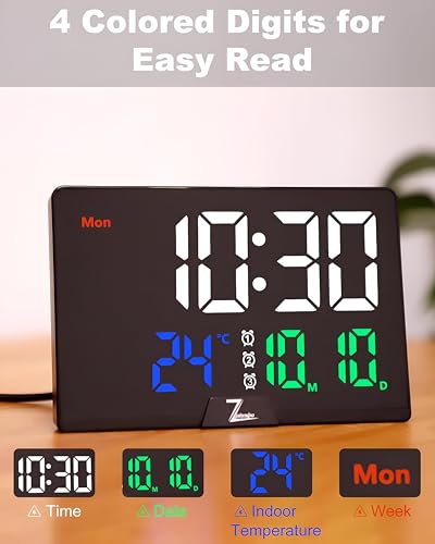 Generic - ساعة منبه رقمية تقويم ملون بأرقام كبيرة وتاريخ ودرجة الحرارة وثلاثة منبهات وشاشة 6.5 بوصة وأضواء ليلية قابلة للتعديل وغفوة تعمل باللمس وتنسيق 12/24 ساعة وضوء نهاري لكبار السن والأطفال