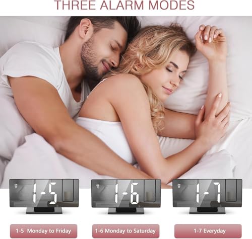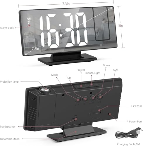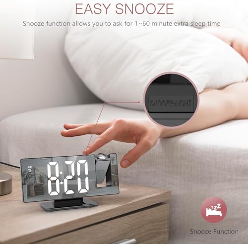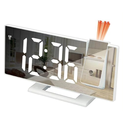 Generic - ساعة منبه رقمية وغفوة مع جهاز عرض دوار 180 درجة، شاشة مراية - ساعة مكتب لغرفة النوم (ساعة منبه رقمية بشاشة عاكسة وبروجكتور دوار 180 درجة) (إطار أبيض)