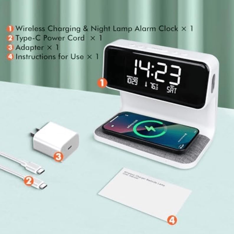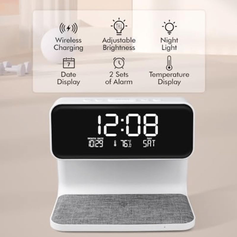 Generic - ساعة منبه رقمية مزودة بلوحة شحن لاسلكي وضوء ليلي ليد قابل للتعتيم بثلاث مستويات مع عرض درجة الحرارة، لون أبيض