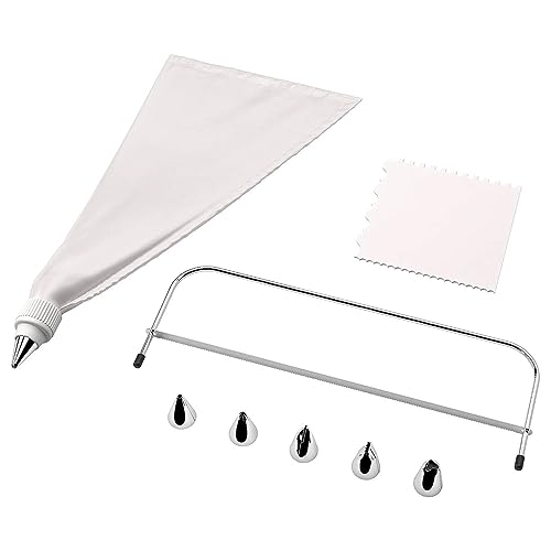 - تتألف من: مشط تزيين (13 × 13 سم)، مقسم الكيك (الطول 31 سم، الارتفاع 11 سم)، 1 كيس المعجنات و6 أنابيب أنابيب (القطر. 2 سم، الارتفاع 3 سم).