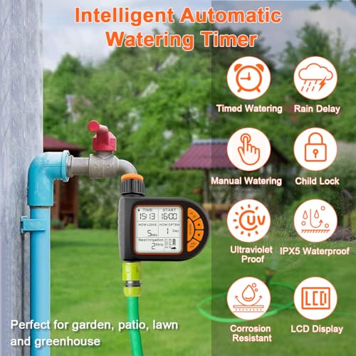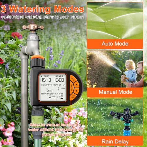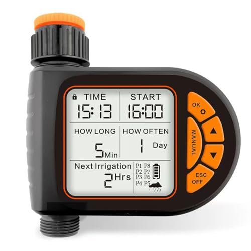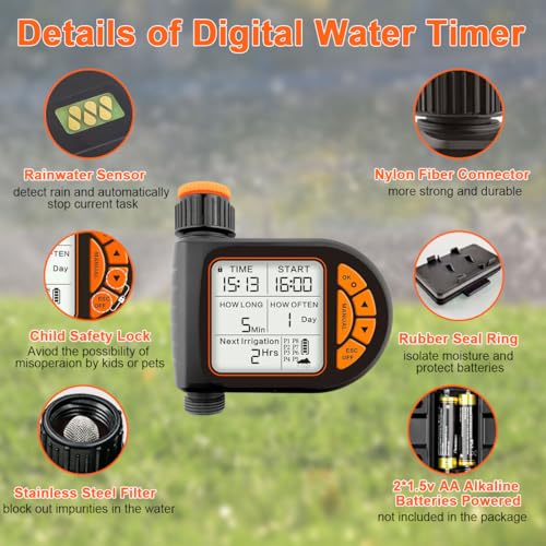 AZYAADIXX - جهاز توقيت ري رقمي اوتوماتيك للحدائق الخارجية، قابل للبرمجة بشاشة ال سي دي كبيرة مقاوم للماء بتصنيف IPX5، مع قفل أمان للأطفال وخاصية تأخير عند هطول المطر