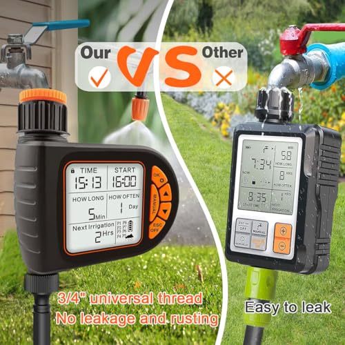 - 【مقاوم للماء ومتين】 تم تصميم مؤقت المياه بالرش من أجل المتانة مع تصنيف IPX5 لمقاومة المياه والغبار، ولمسة نهائية مقاومة للأشعة فوق البنفسجية، ومواد مضادة للصدأ، مما يتيح الاستخدام طويل الأمد تحت أشعة الشمس الشديدة والمطر الغزير دون إتلاف التقلبات السريعة في درجات الحرارة. يتميز غطاء البطارية بسدادة مطاطية لعزل الرطوبة وحماية البطارية. الموصل الرئيسي لمؤقت المياه الرقمي مصنوع من ألياف النايلون المقوى، مما يوفر مقاومة أكبر للصدمات ومقاومة للاهتراء مقارنة ببلاستيك ABS.