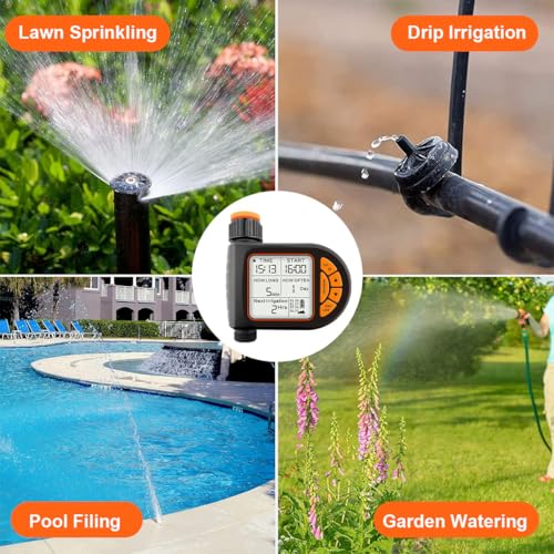 - 【مؤقت مياه متعدد الوظائف】 مؤقت المياه الرقمي مثالي للري بالتنقيط بالجاذبية في الهواء الطلق، وسقي خرطوم الحديقة، وجهاز التحكم في رش العشب، ونظام رذاذ الدفيئة، وملء حمام السباحة، وقطارة حمام الطيور، وشرب الحيوانات الأليفة، إلخ. يمكن أن يلبي مؤقت المياه شديد التحمل محبي الزهور وعشاق الزراعة الداخلية والبستاني المحترف ومورد البستنة واحتياجات الحياة اليومية لمؤقت الرش. تسمح لك بالتحكم الكامل في ري كل منطقة في الفناء والحديقة الخاصة بك!