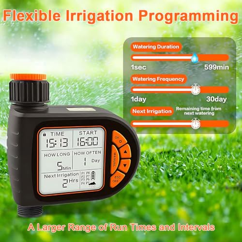 - 【برمجة تلقائية ومرنة】 يتميز مؤقت المياه الرقمي الخاص بنا ببرنامج رقمي وتلقائي، ويوفر مرونة واسعة لتوقيت الري وتردده، مما يسمح بتخصيص الري. يمكنك ضبط مدة الري من ثانية واحدة إلى 599 دقيقة، وضبط التردد من يوم واحد إلى 30 يومًا. مزود بـ 8 برامج ري للتحكم في التوقيت (P1-P2-P3-P4-P5-P6-P7-P8)، مؤقت مياه الصنبور هذا مثالي للحديقة والفناء والشرفة والعشب والدفيئة.