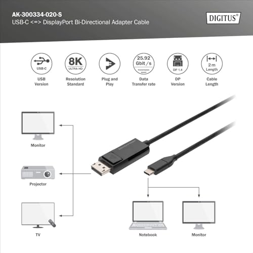 Digitus - كابل ثنائي الاتجاه USB نوع C إلى ديسبلاي بورت من ديجيتوس دقة 8K بتردد 30 هرتز كحد أقصى، الطول: 2 متر، أسود
