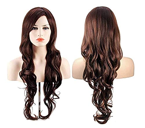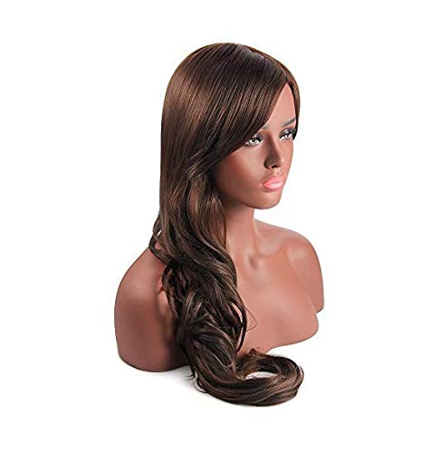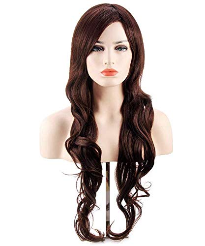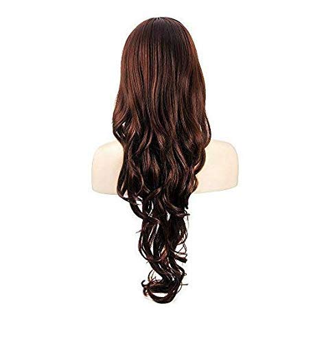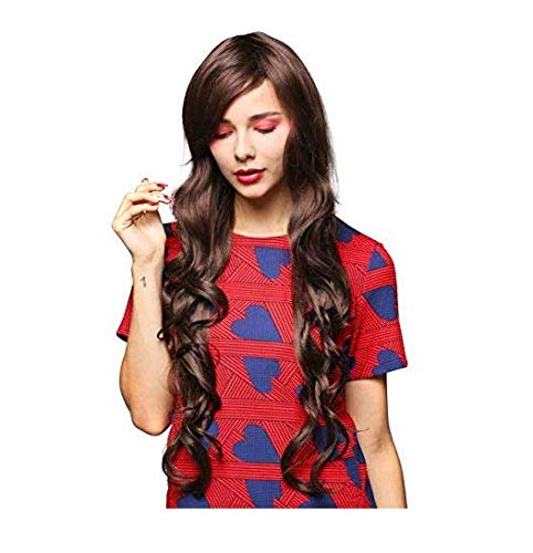 DILLARDS - ديلاردز شعر مستعار طويل مجعد بني - شعر مستعار صناعي مجعد 34 مع غرة مائلة للنساء، شعر طبيعي مثل الشعر الحقيقي للحفلات اليومية والحفلات التنكرية (بني داكن)