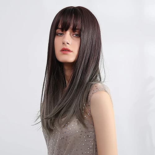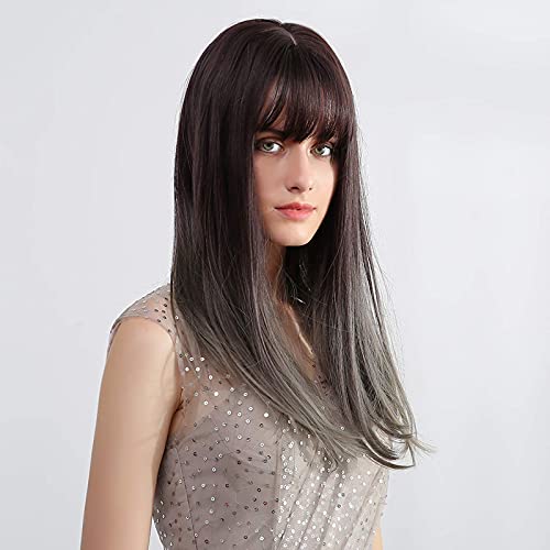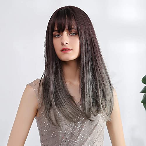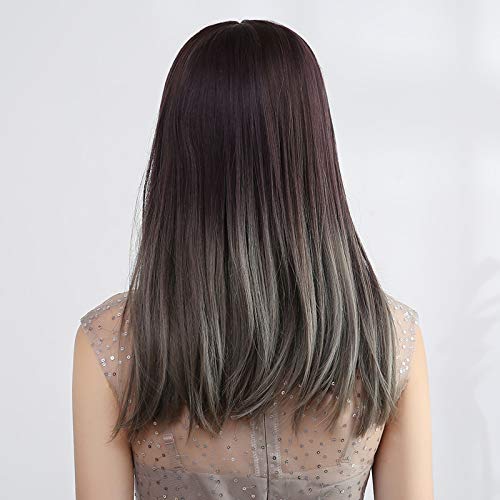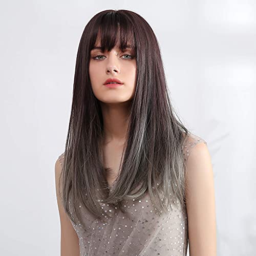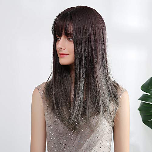 DILLARDS - باروكة طويلة ومستقيمة بورجرجاو من شعر صناعي مقاوم للحرارة مع غرة للنساء والبنات من ديلاردز للحفلات والمناسبات التنكرية (باروكة بلون رمادي متدرج بطول 46 سم)