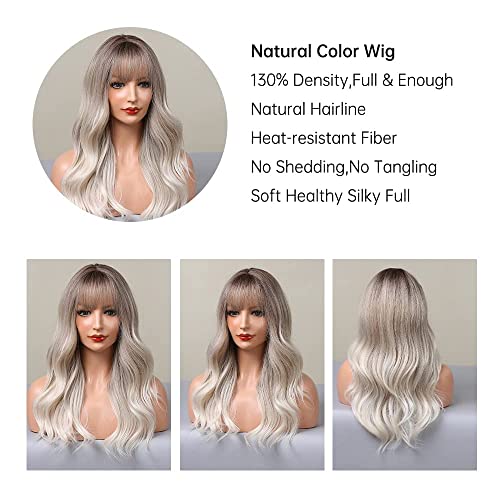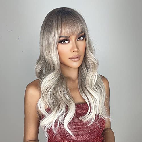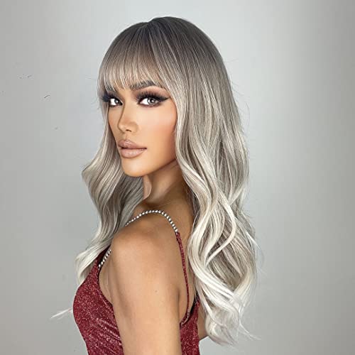 DILLARDS - ديلاردز شعر مستعار رمادي مع غرة من ايمور، شعر مستعار طويل مجعد بجذور داكنة للنساء، شعر مستعار صناعي بمظهر طبيعي من الالياف المقاومة للحرارة