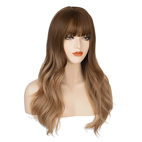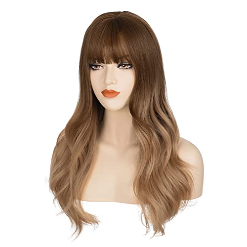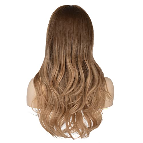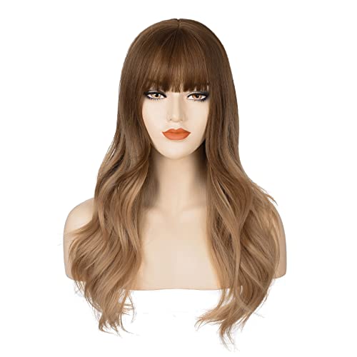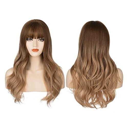 DILLARDS - شعر مستعار طويل مموج من ديلاردز، بلون بني متدرج إلى أشقر، مع غرة وفرق في المنتصف، مصنوع من ألياف مقاومة للحرارة، للنساء، مقاس واحد، (A0011)