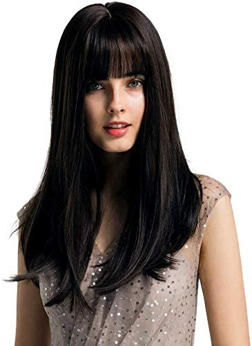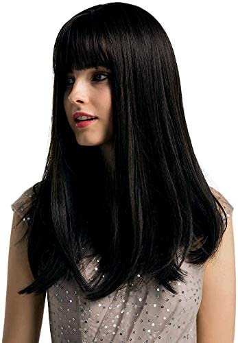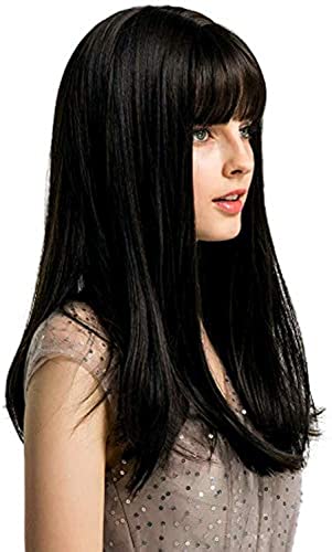 - ديلاردز شعر مستعار بطول شودر مع غرة من جياناي، شعر مستعار حريري مفرود بلون اسود للنساء، شعر مستعار من الالياف الصناعية المقاومة للحرارة بطول 18 انش