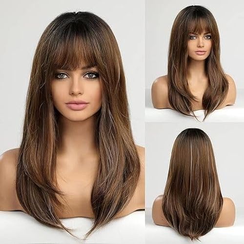 DILLARDS - باروكة شعر طويل بلون بني فاتح بجذور بلون غامق للنساء، باروكة شعر صناعي مع غرة، باروكة شعر بغرة أمامية أنيقة للنساء من ديلاردز