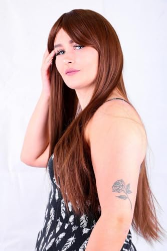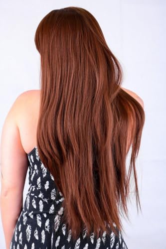 DILLARDS - باروكة شعر طويل بلون بني فاخر بقصة مستقيمة من الألياف المقاومة للحرارة بمظهر طبيعي مع غرة جانبية من ديلاردز