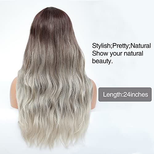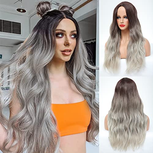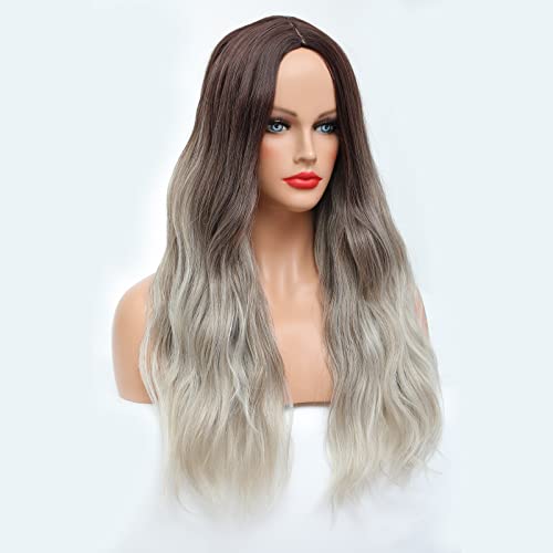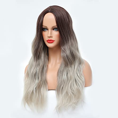 DILLARDS - شعر مستعار طويل بني للنساء ذوات البشرة البيضاء ميمو بمظهر طبيعي طويل بني غامق صناعي إلى رمادي مموج متوسط من ديلاردز