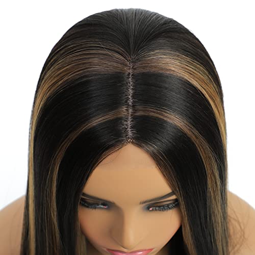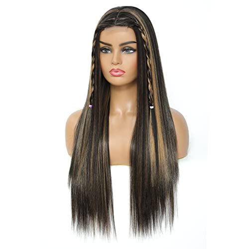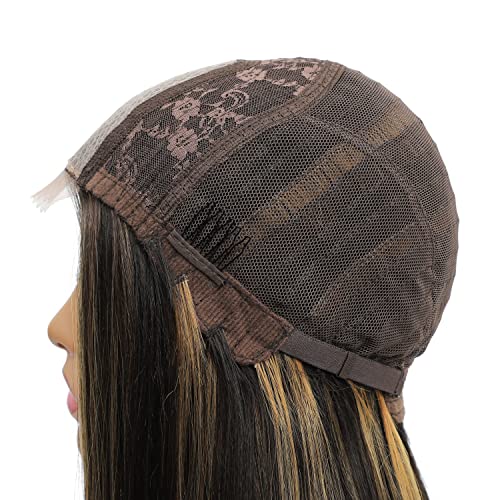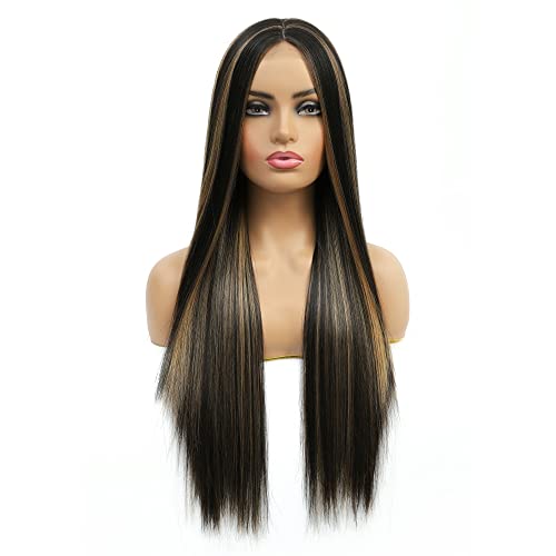 DILLARDS - باروكة شعر صناعية طويلة مستقيمة مفروقة من المنتصف بخصلات شعر، مصنوعة من ألياف صناعية مقاومة للحرارة، شعر مستعار بمظهر طبيعي للاستخدام اليومي من ديلاردز، طول 66 سم (باروكة شعر بلون بني بخصلات شقراء)