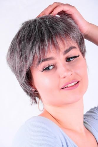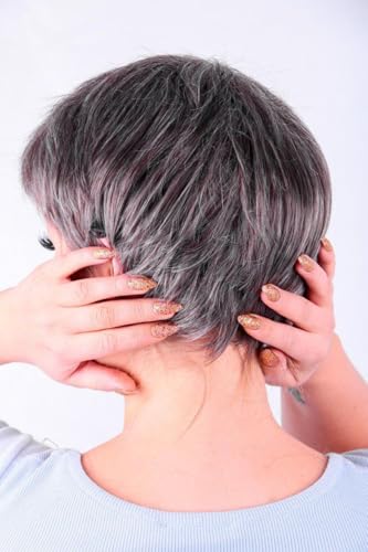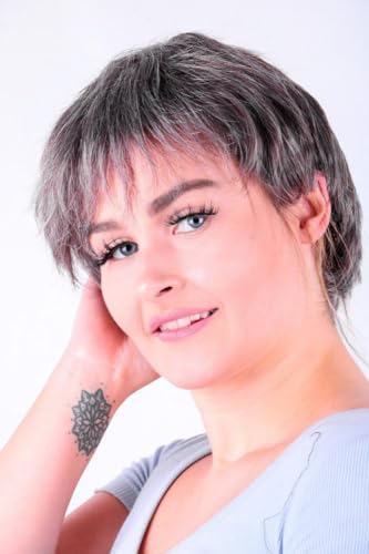 DILLARDS - شعر مستعار صناعي قصير بقصة بيكسي باللون الرمادي بنمط منسوج بطبقات من الألياف المقاومة للحرارة، قطعة شعر تنكرية بمظهر طبيعي من ديلاردز