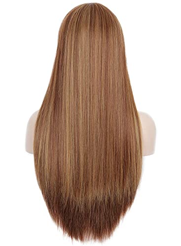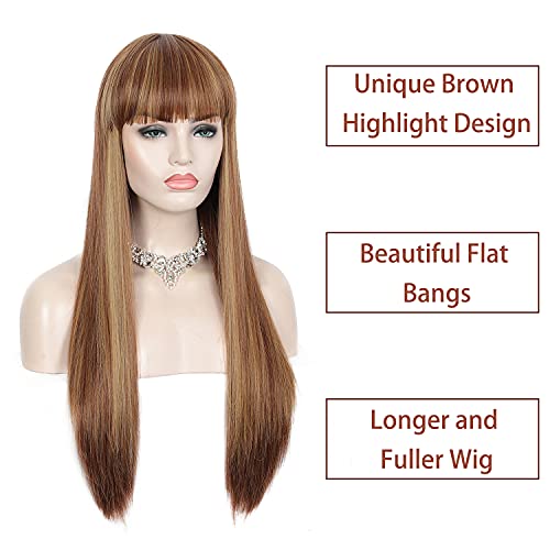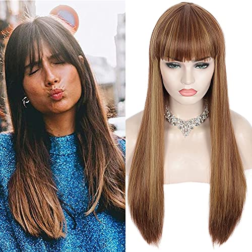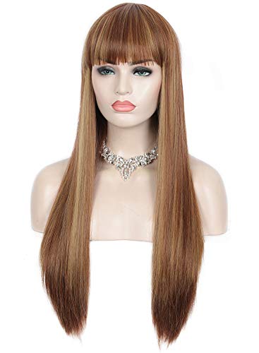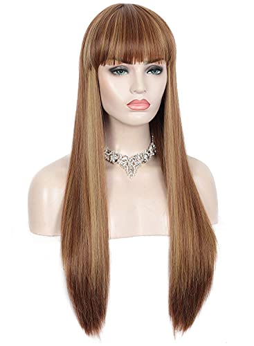 DILLARDS - باروكات شعر طويل وبقصة مستقيمة مع غرة بمظهر طبيعي، شعر من ألياف صناعية مقاومة للحرارة للنساء ذوات البشرة السمراء والبيضاء للاستخدام اليومي والحفلات من ديلاردز - 71 سم، لون بني مع خصلات شقراء